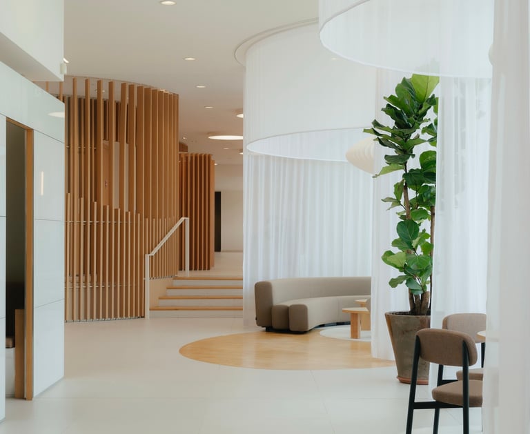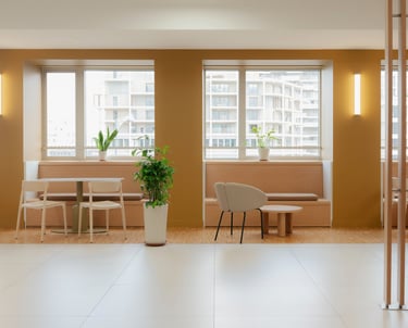 Ce projet de rénovation met en valeur les espaces d’accueil et partagés pour offrir un cadre à la fois fonctionnel et élégant.