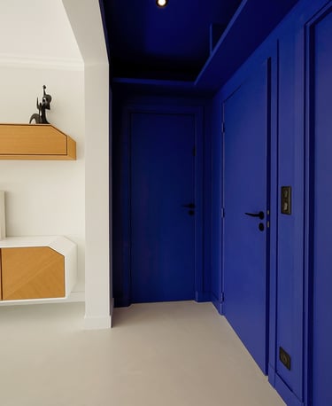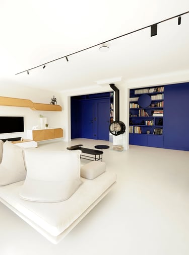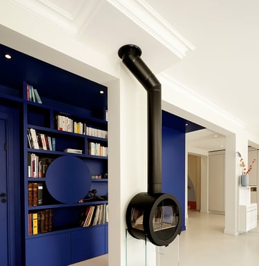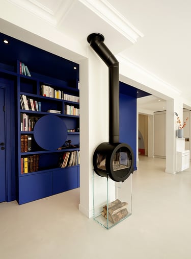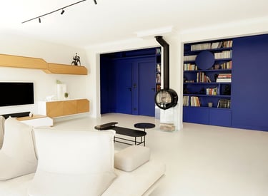 Dans ce duplex, le bleu Klein a été choisi comme teinte principale pour le salon. Peint sur un seul mur, il crée une impression de profondeur tout en apportant une atmosphère apaisante et sereine. Ce choix invite à la détente, par exemple en savourant un bon livre prélevé dans la bibliothèque sur-mesure qui s’intègre harmonieusement à l’espace.